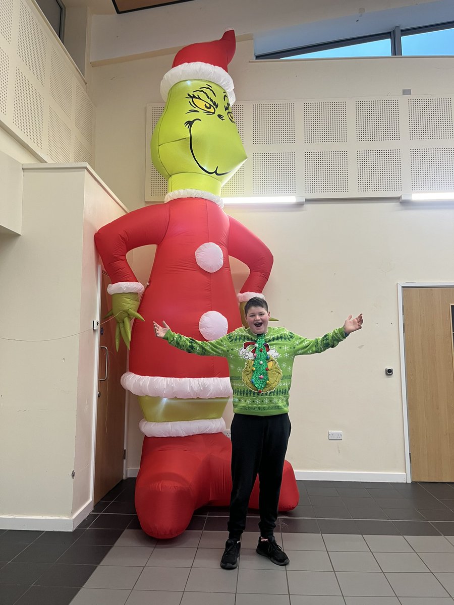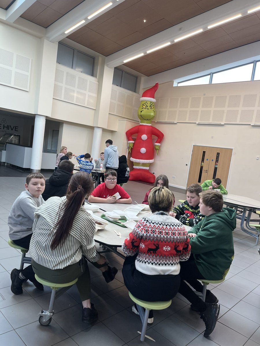 Look who's crashing our school Christmas dinner! The giant Grinch is bringing some extra holiday cheer to our festivities. #ChristmasDinner #GrinchInvasion 🎄🎅"